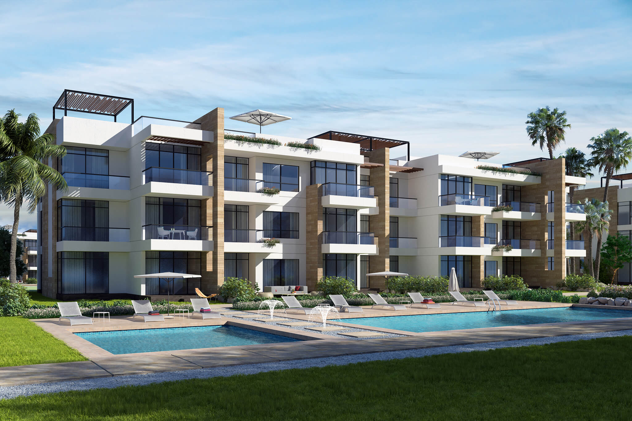 Caesar Bay Residences master-plan design takes into consideration the site topography and the natural surrounding context. The residences are built in tiers to provide a beautiful panoramic sea view. Designing a lifestyle rather than concrete buildings; the architectural design concept is to blend architecture, landscape and beach, in addition to indoor and outdoor spaces. This is achieved by providing architectural and interior features that emphasize maximum natural light penetration and ventilation to the internal spaces through green courtyards, high ceiling, skylights, full façade glazing with sea view, large terraces and shaded roof decks.