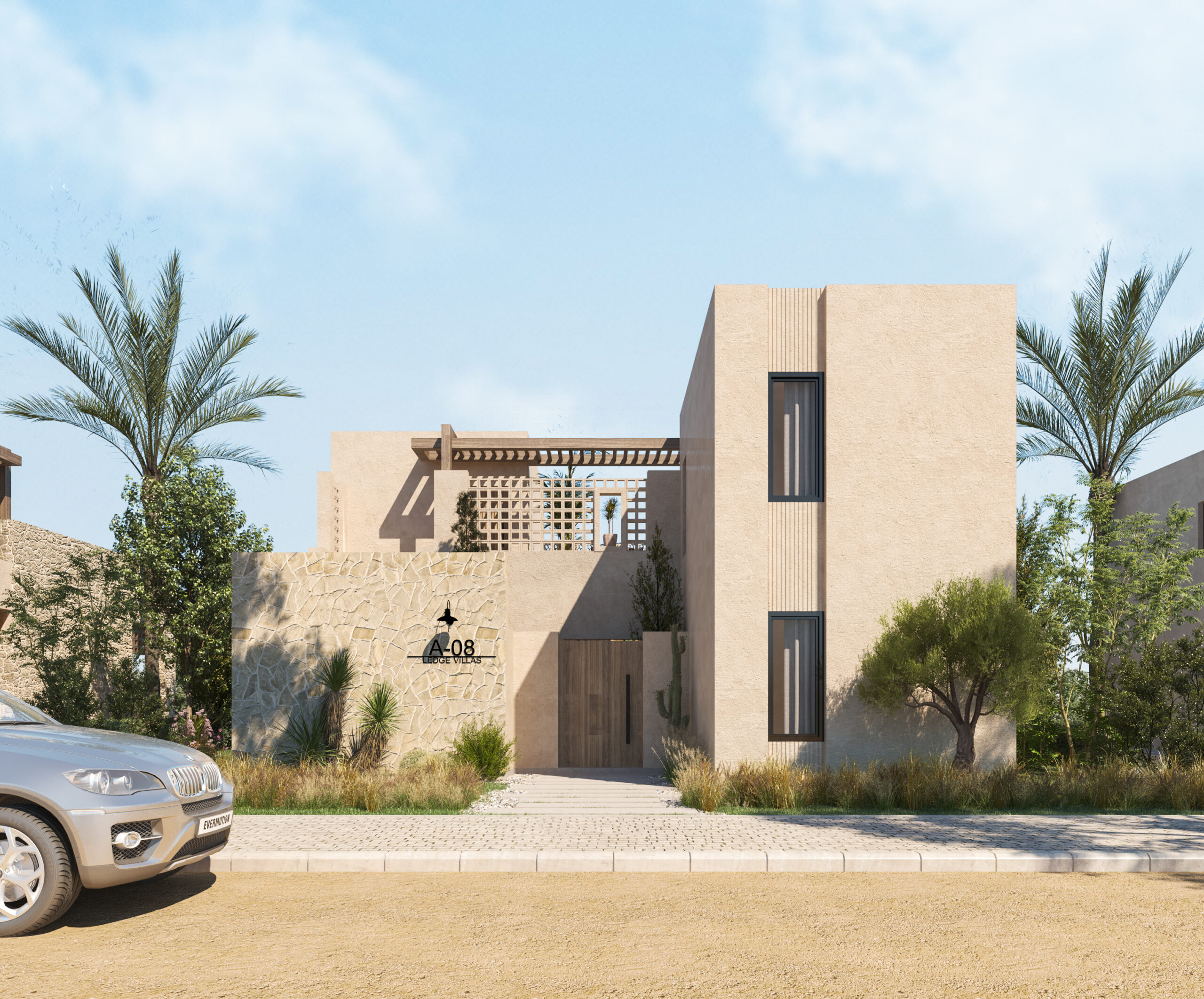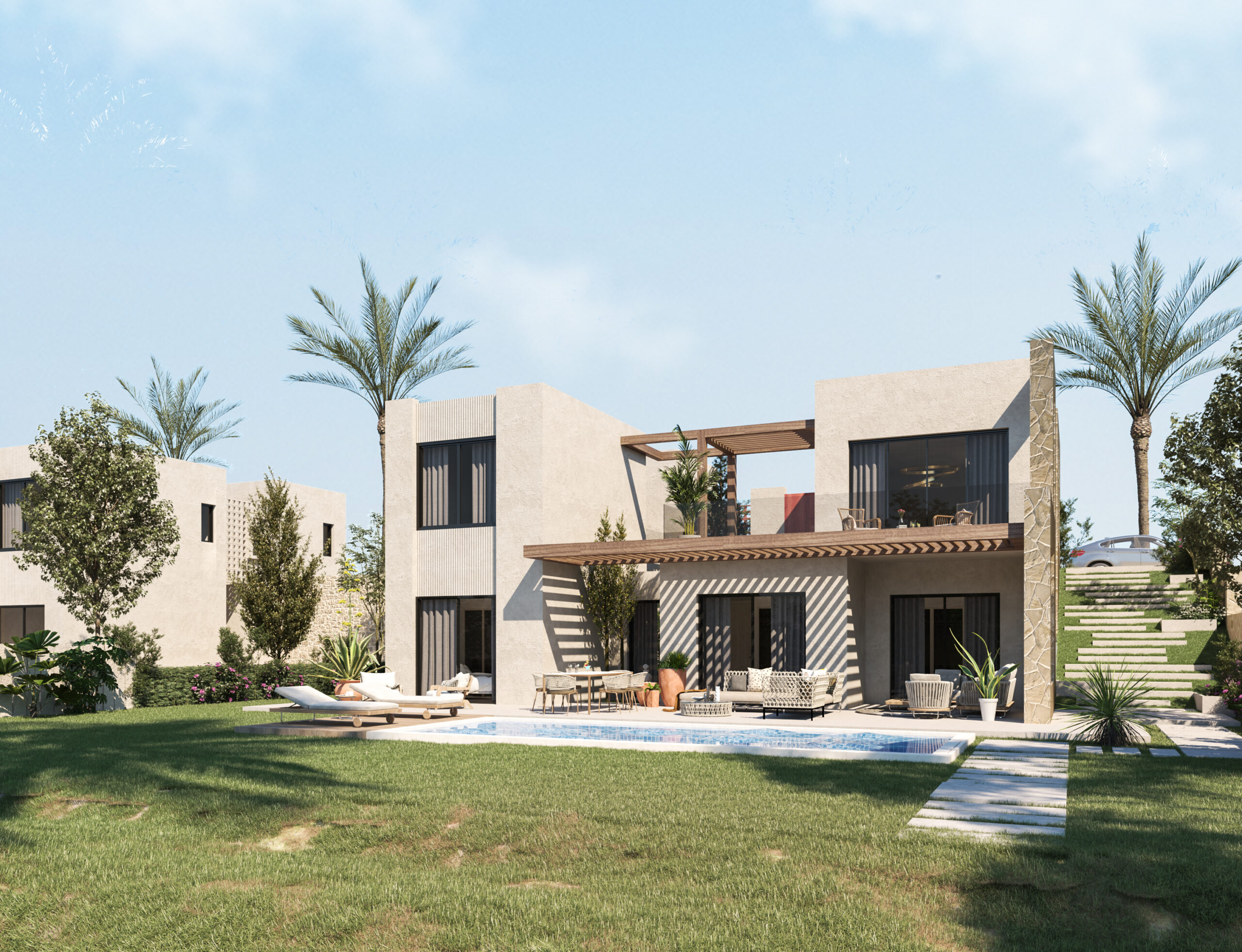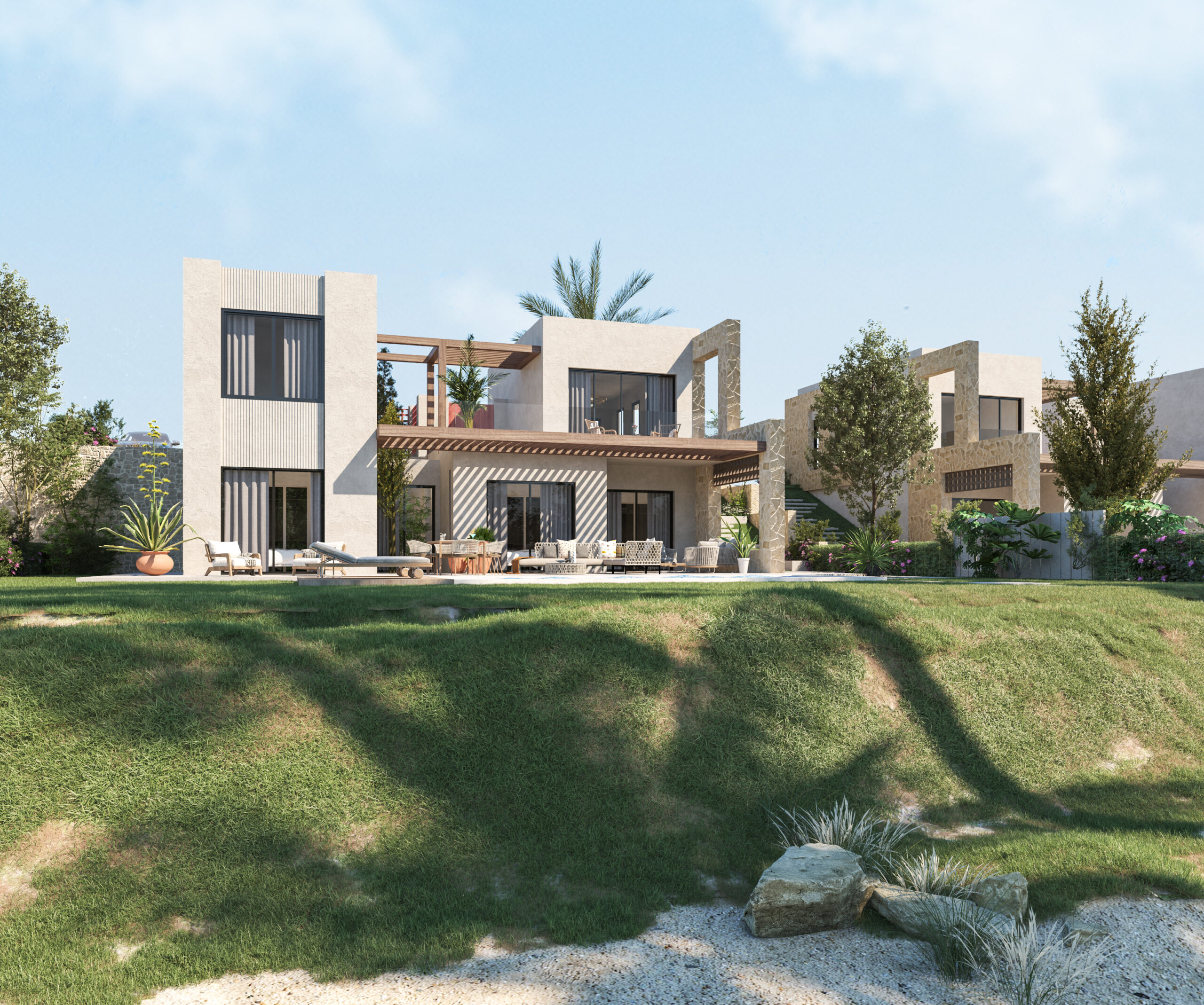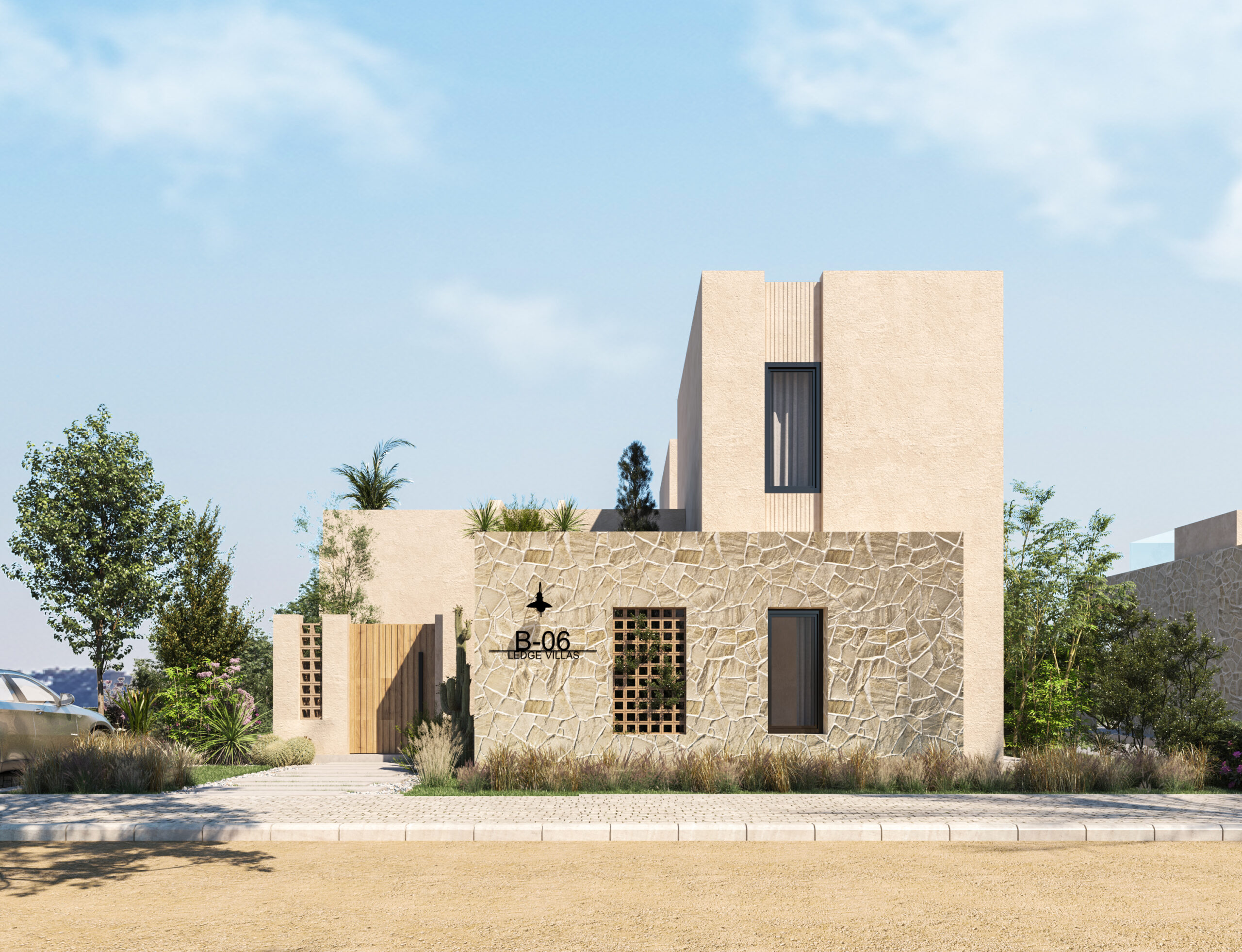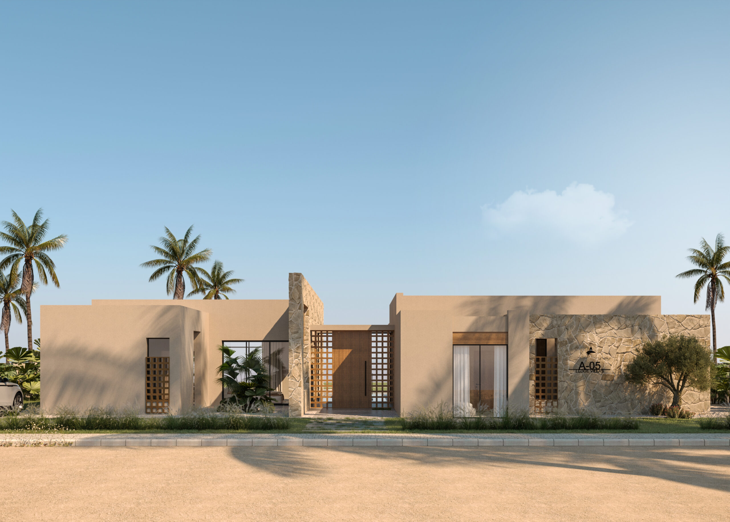 Ledge Flare provides a nice and wide view for the main spaces of the houses. In addition, the outdoor side courtyards and covered outdoor living spaces emphasize on blurring the boundary between in and outdoor areas. The target is to introduce a livable land boundary not a livable house boundary. There is an interplay with natural light by controlling its indirect access to each room. The spaces created between the volumes create a contrast between light and shadow throughout the building.