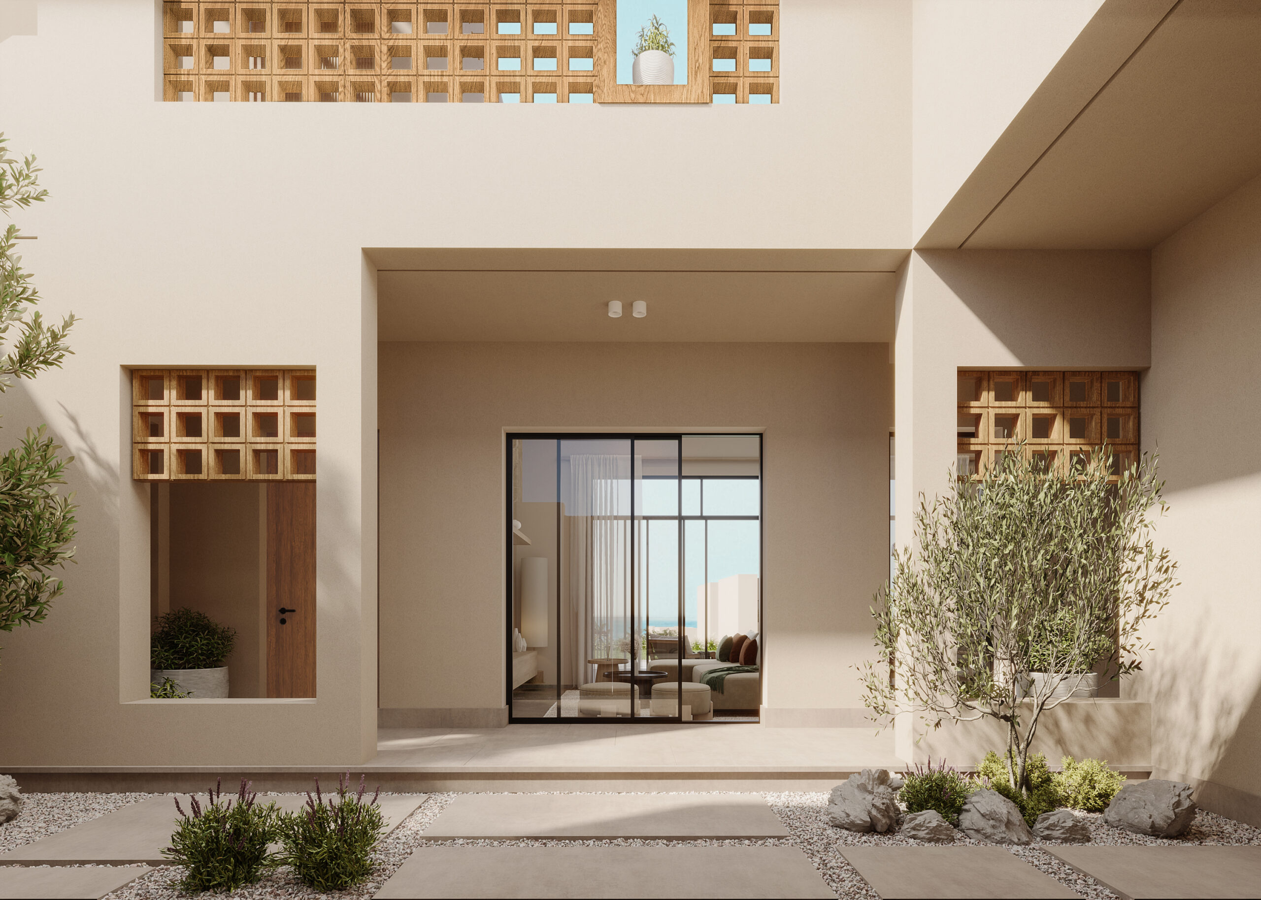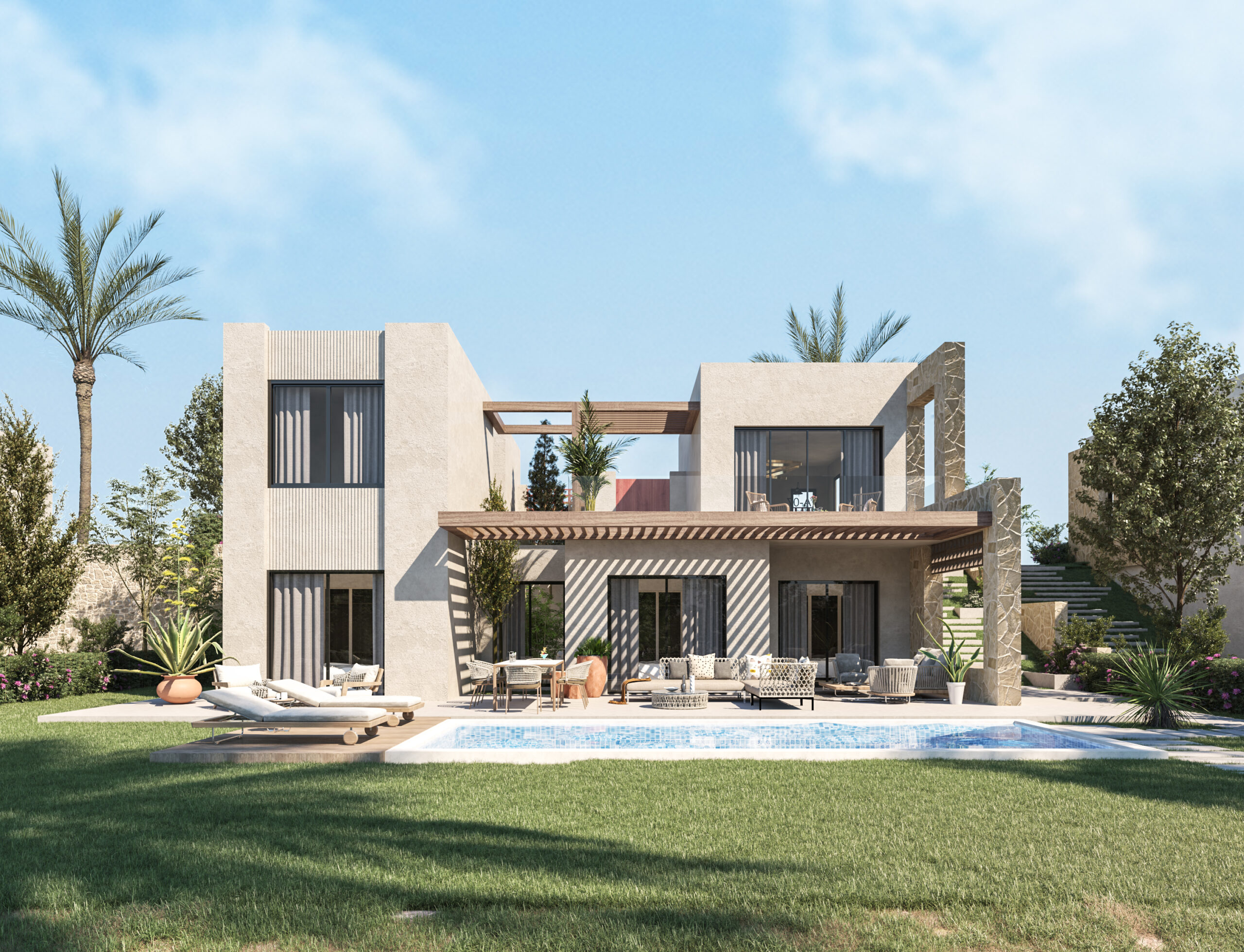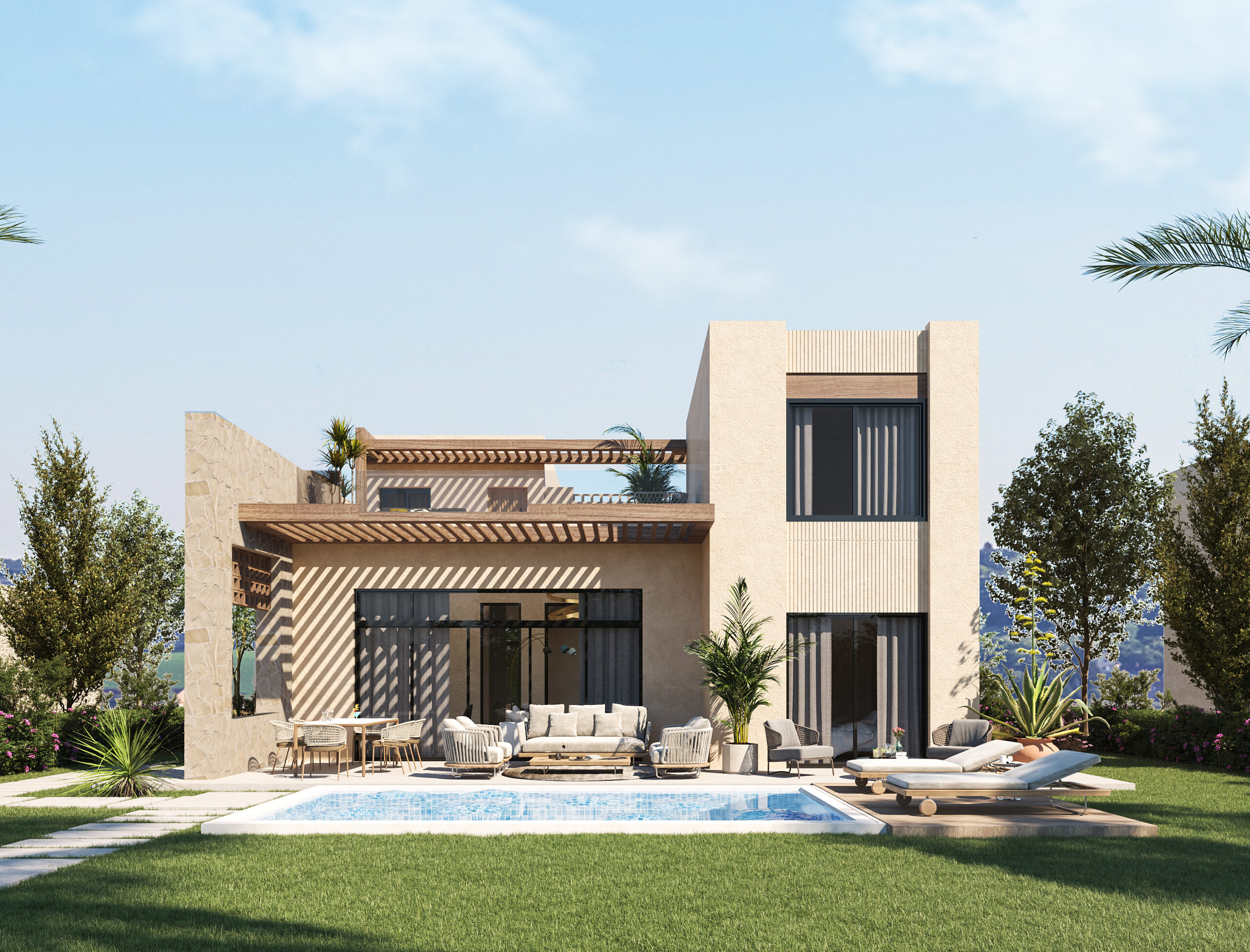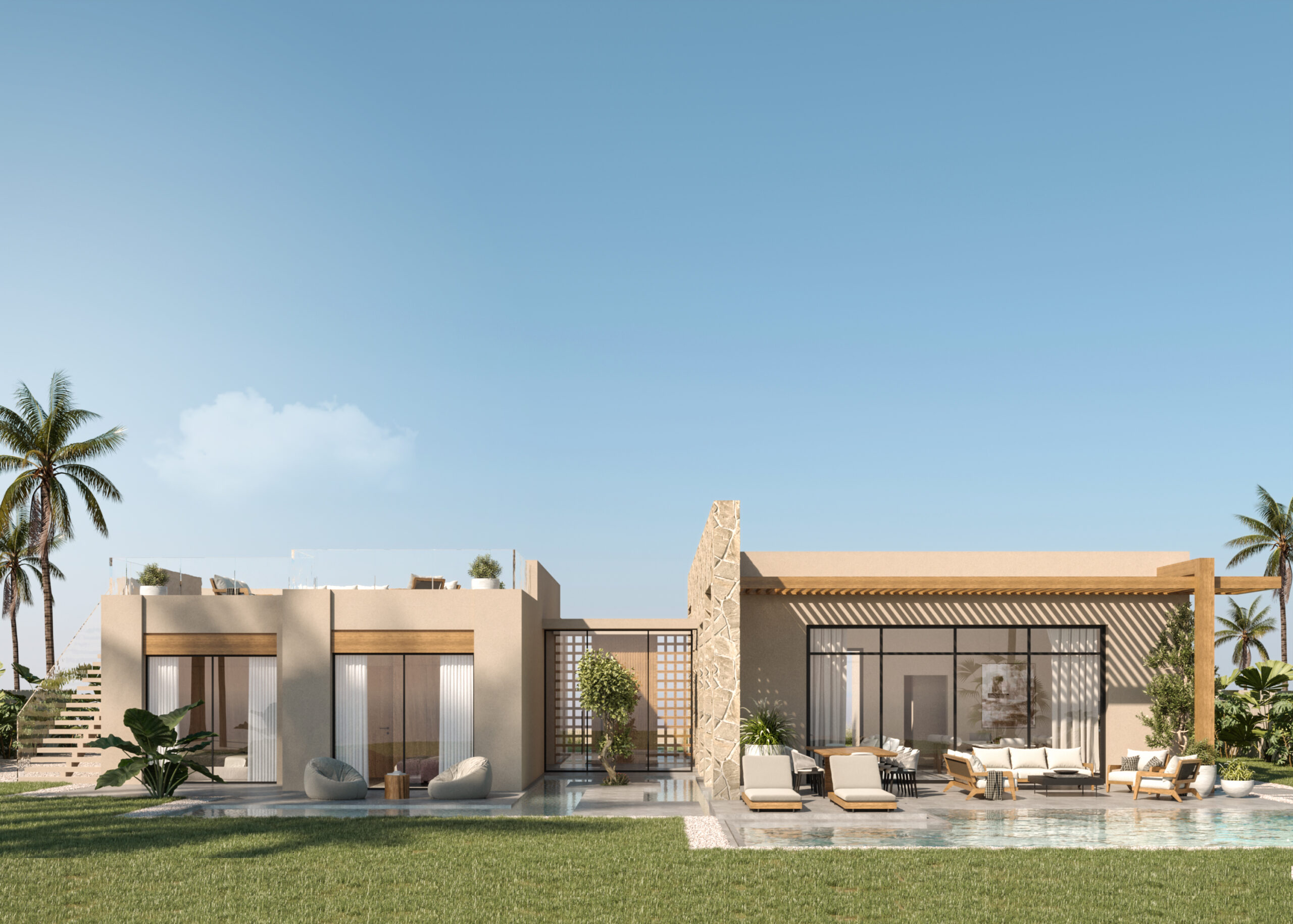Ledge Flare provides a nice and wide view for the main spaces of the houses. In addition, the outdoor side courtyards and covered outdoor living spaces emphasize on blurring the boundary between in and outdoor areas. The target is to introduce a livable land boundary not a livable house boundary. There is an interplay with natural light by controlling its indirect access to each room. The spaces created between the volumes create a contrast between light and shadow throughout the building.