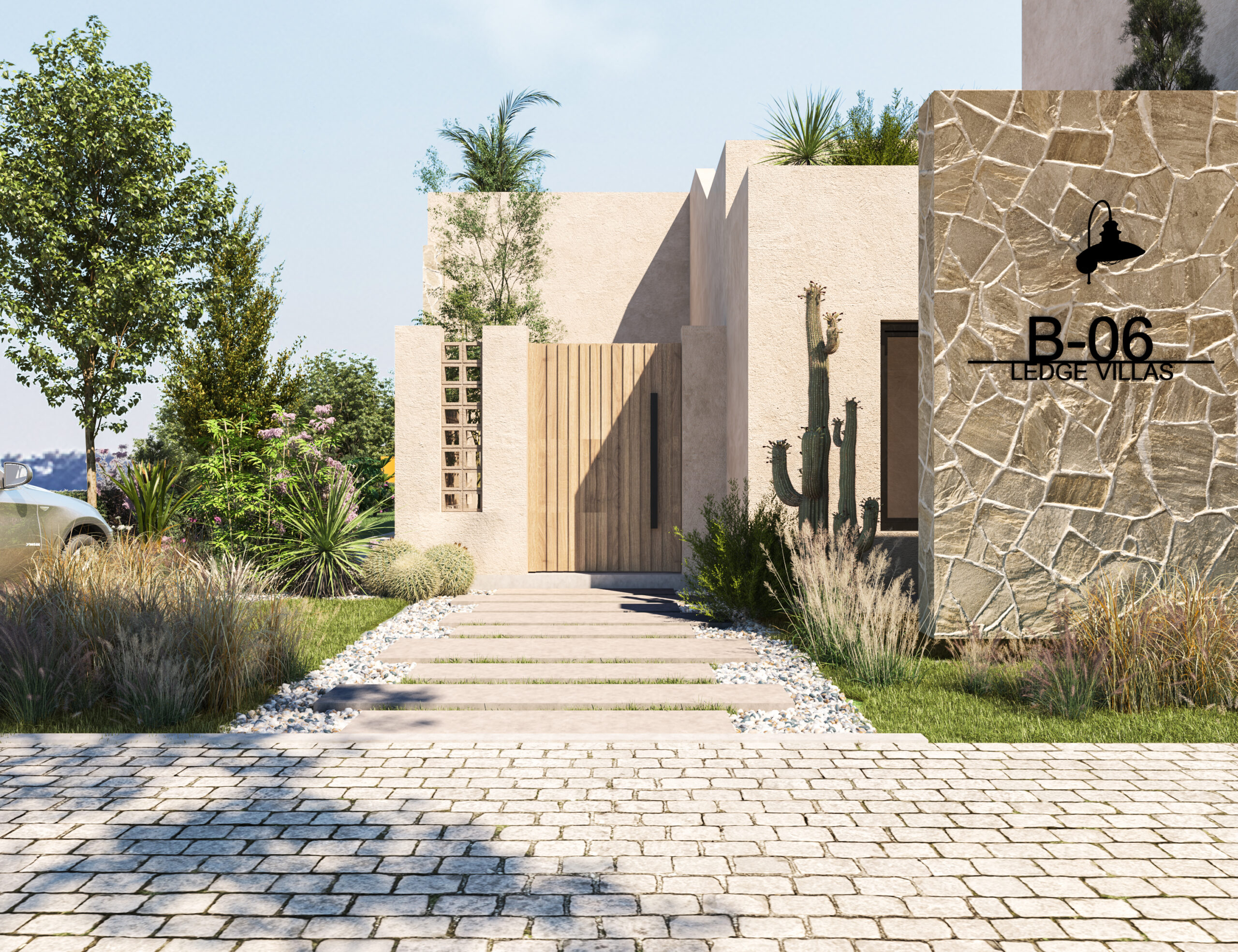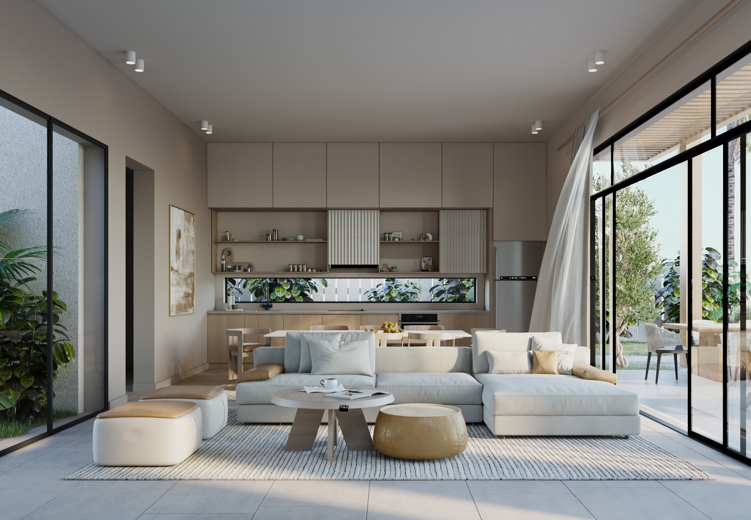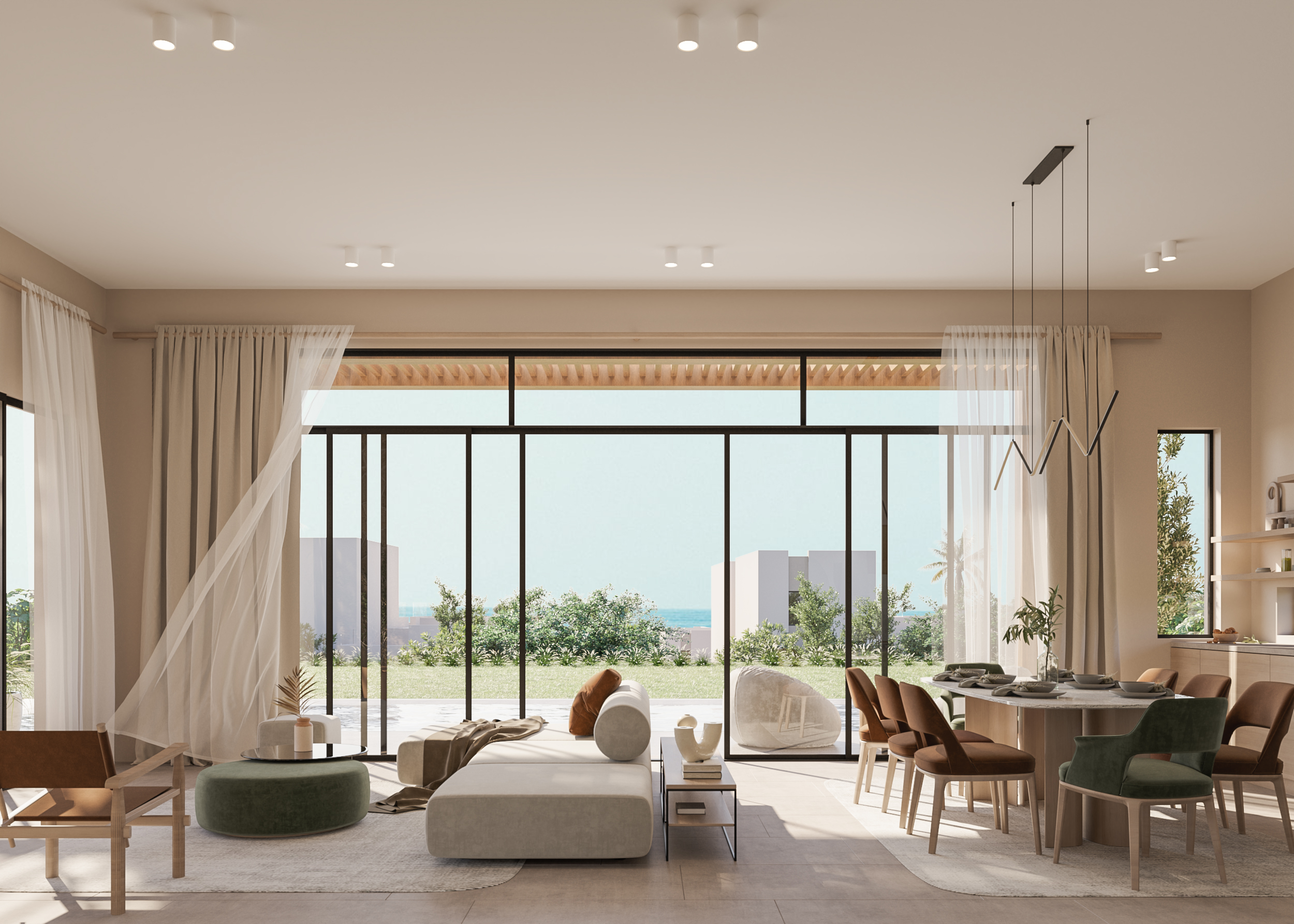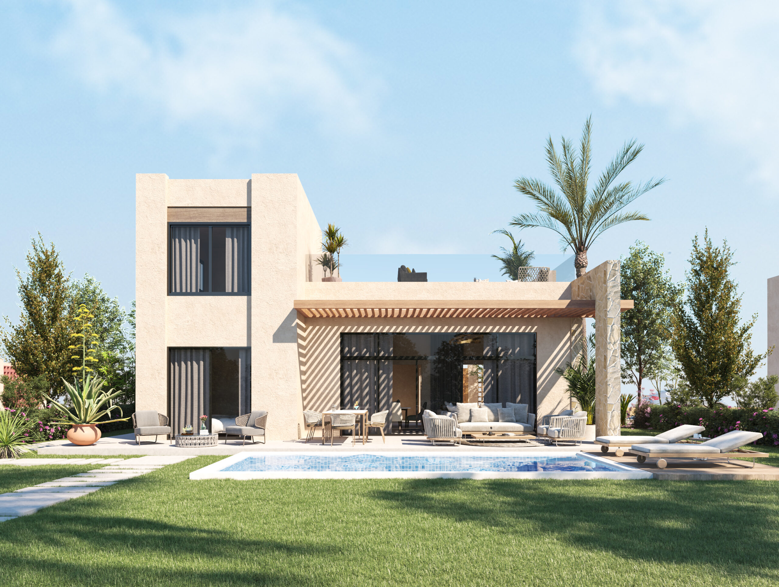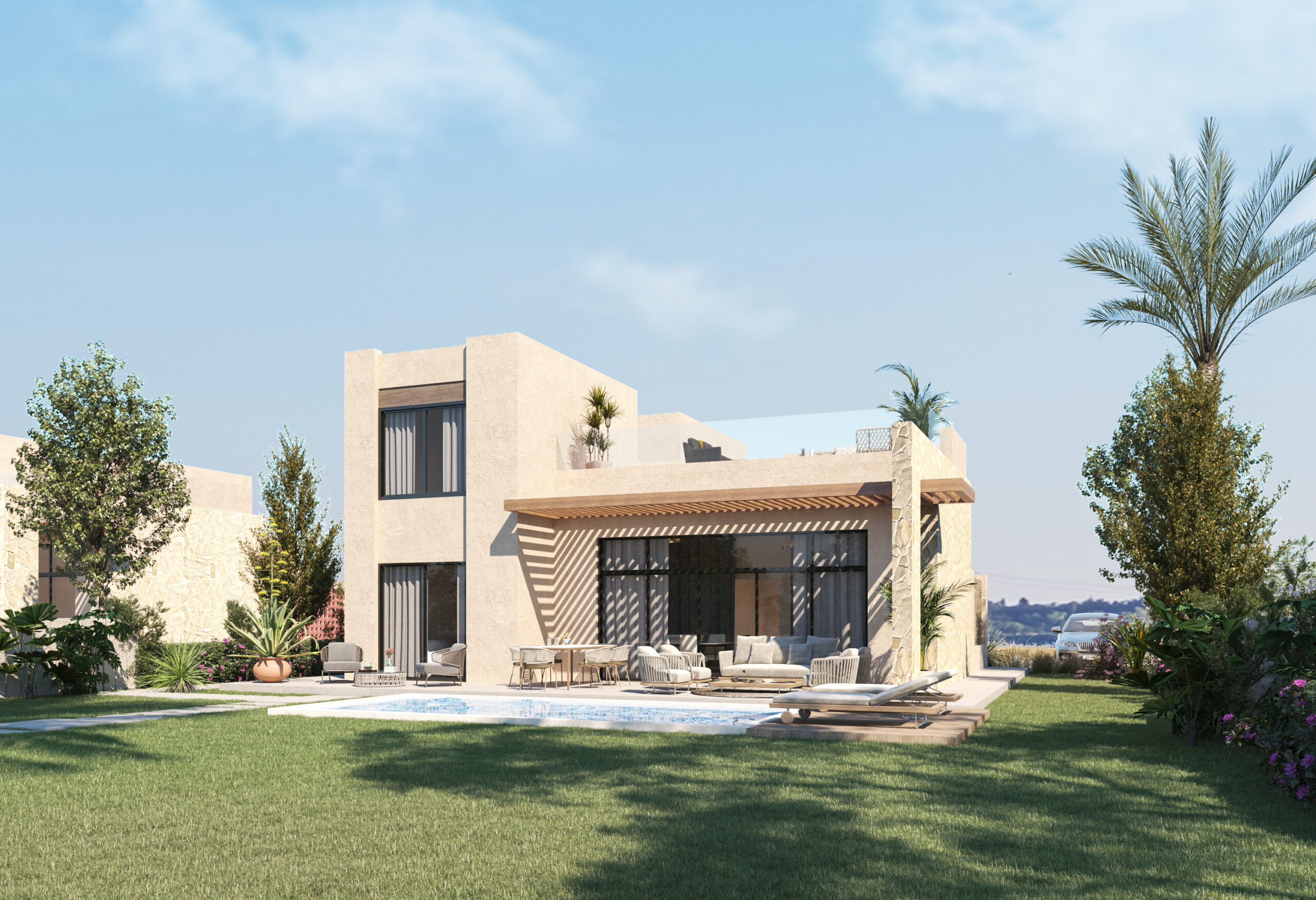 Ledge Flare provides a nice and wide view for the main spaces of the houses. In addition, the outdoor side courtyards and covered outdoor living spaces emphasize on blurring the boundary between in and outdoor areas. The target is to introduce a livable land boundary not a livable house boundary. There is an interplay with natural light by controlling its indirect access to each room. The spaces created between the volumes create a contrast between light and shadow throughout the building.