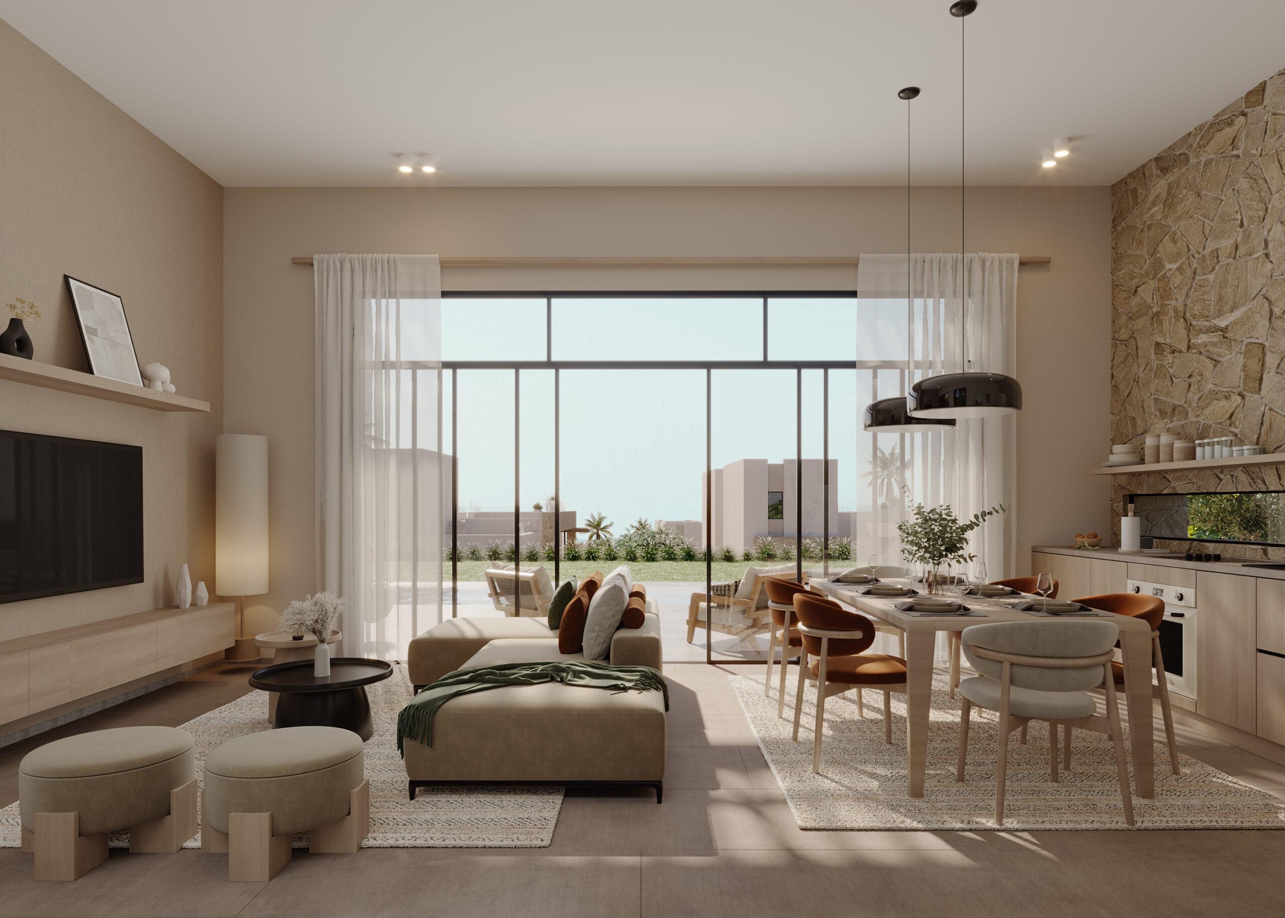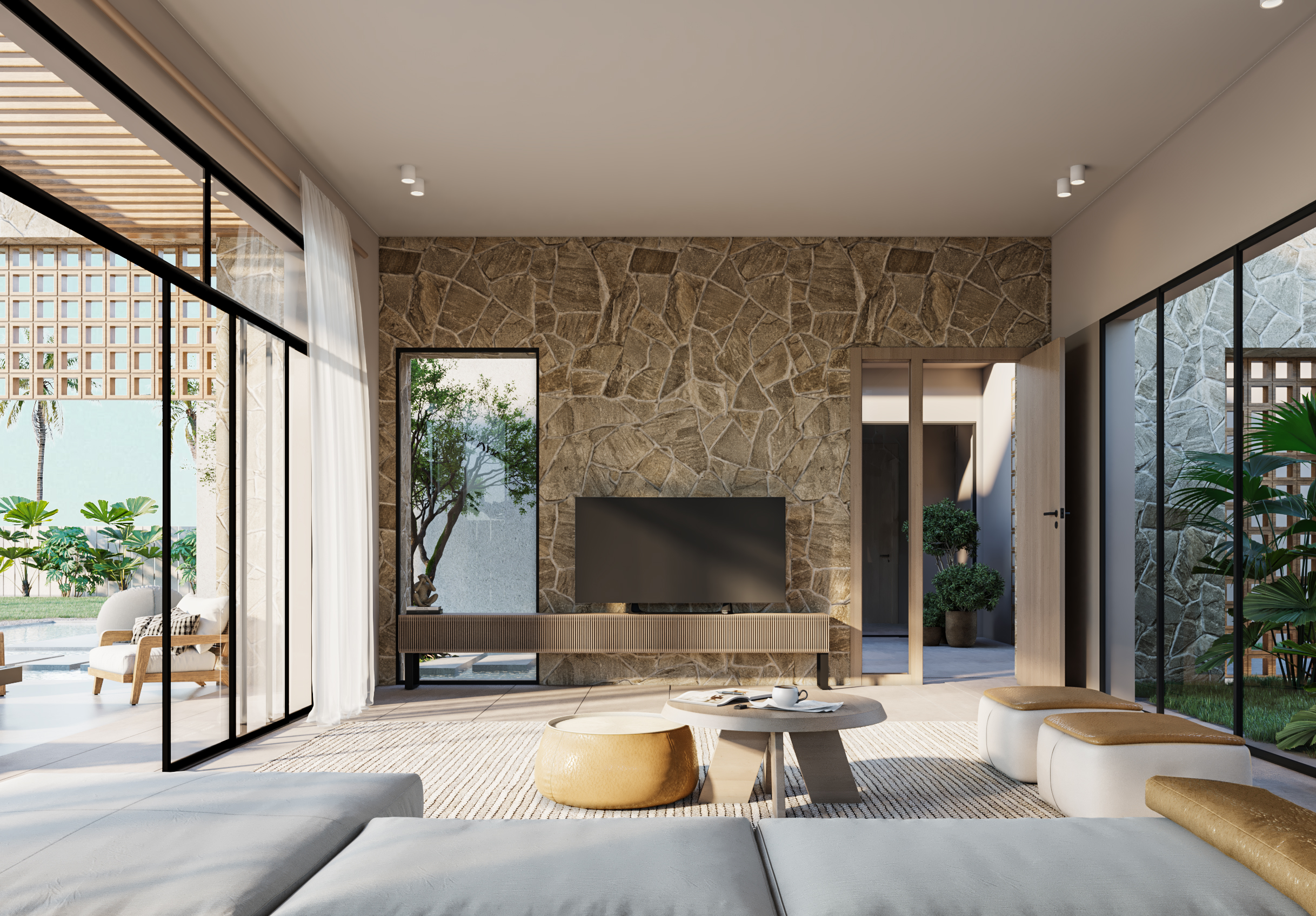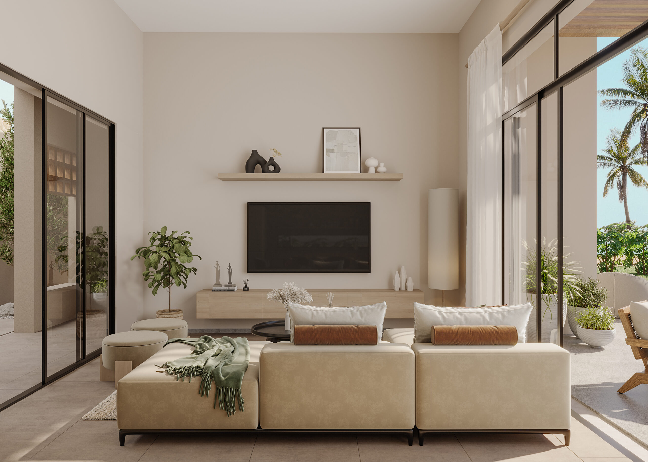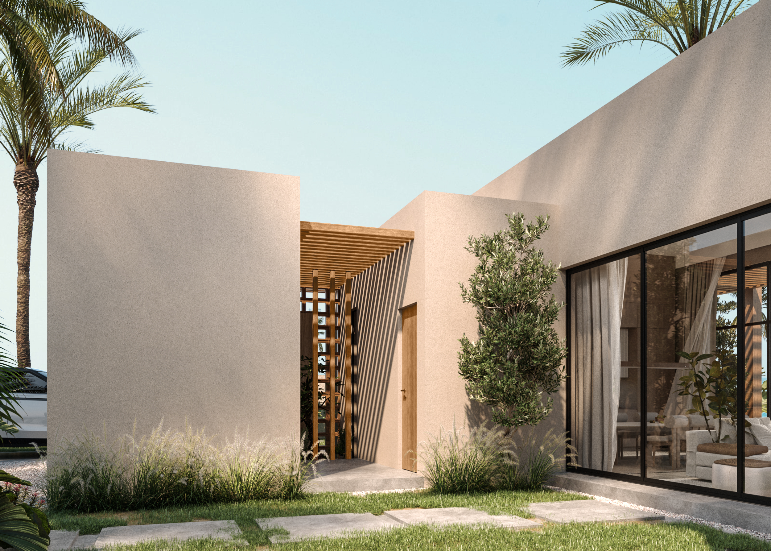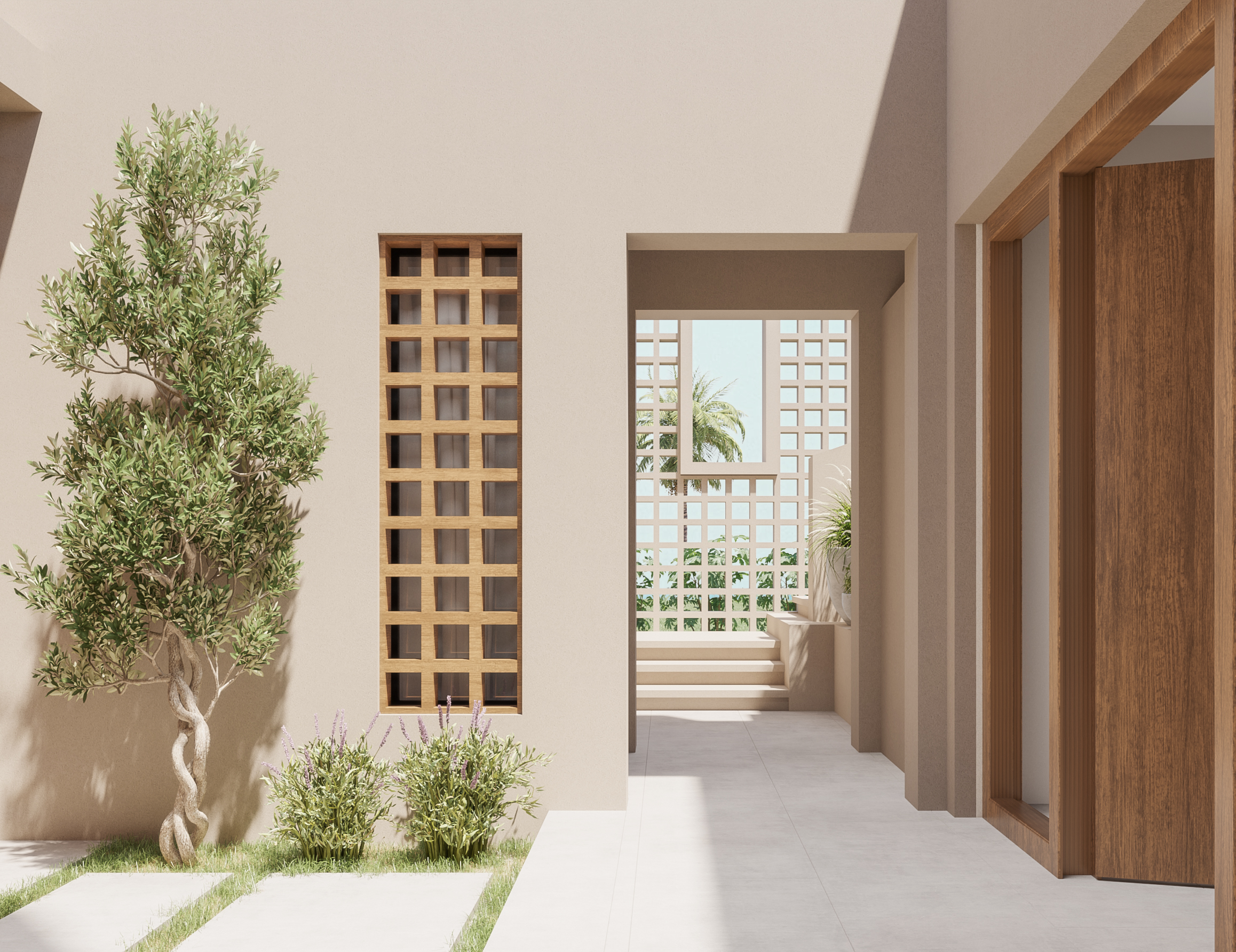 Ledge Flare provides a nice and wide view for the main spaces of the houses. In addition, the outdoor side courtyards and covered outdoor living spaces emphasize on blurring the boundary between in and outdoor areas. The target is to introduce a livable land boundary not a livable house boundary. There is an interplay with natural light by controlling its indirect access to each room. The spaces created between the volumes create a contrast between light and shadow throughout the building.
