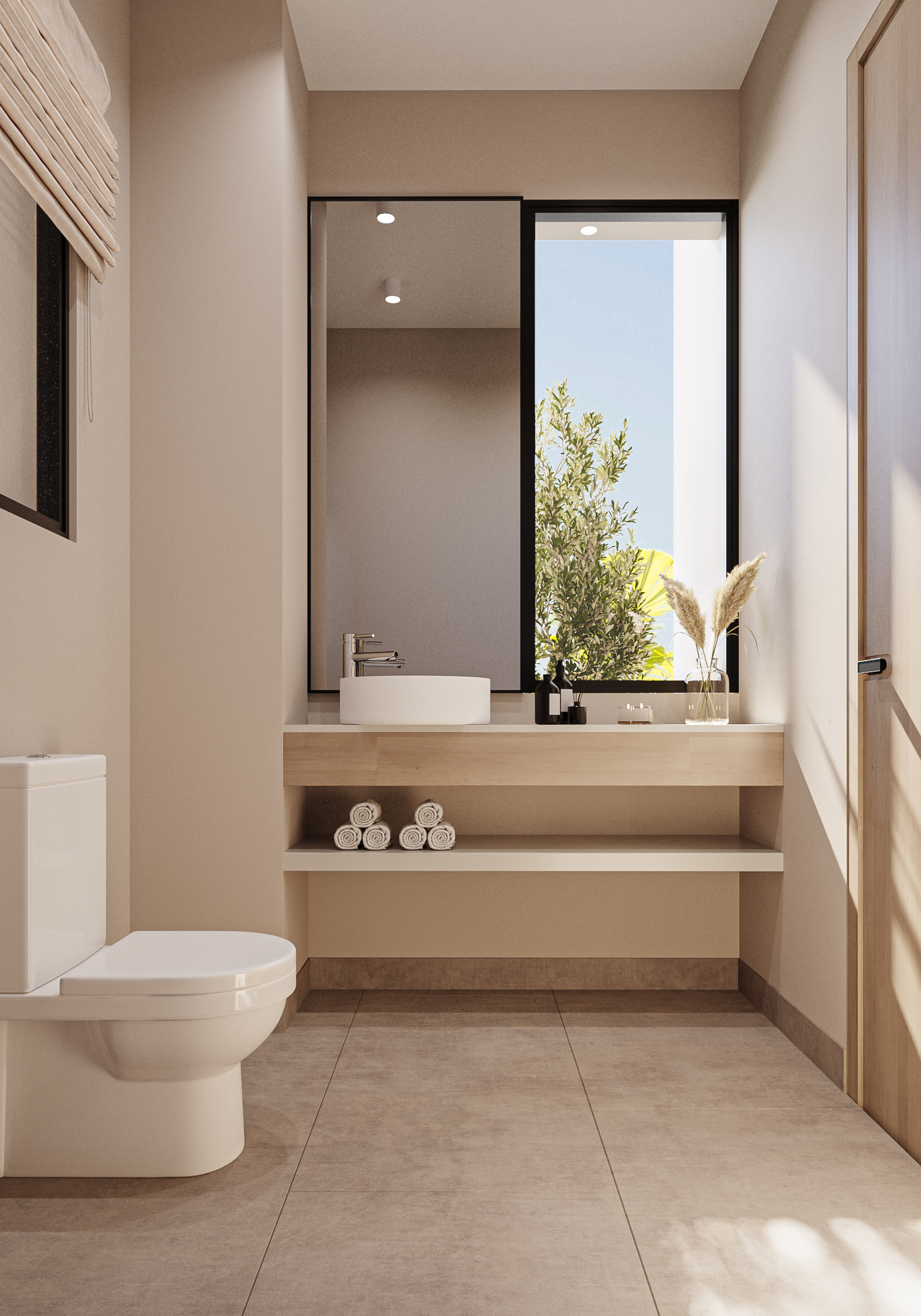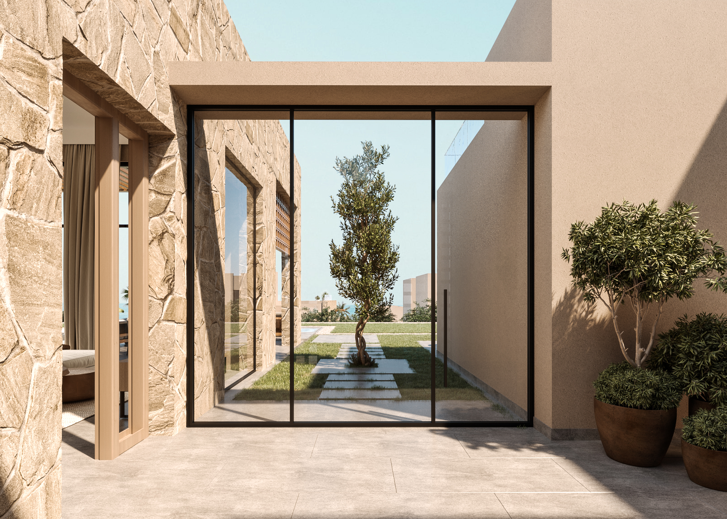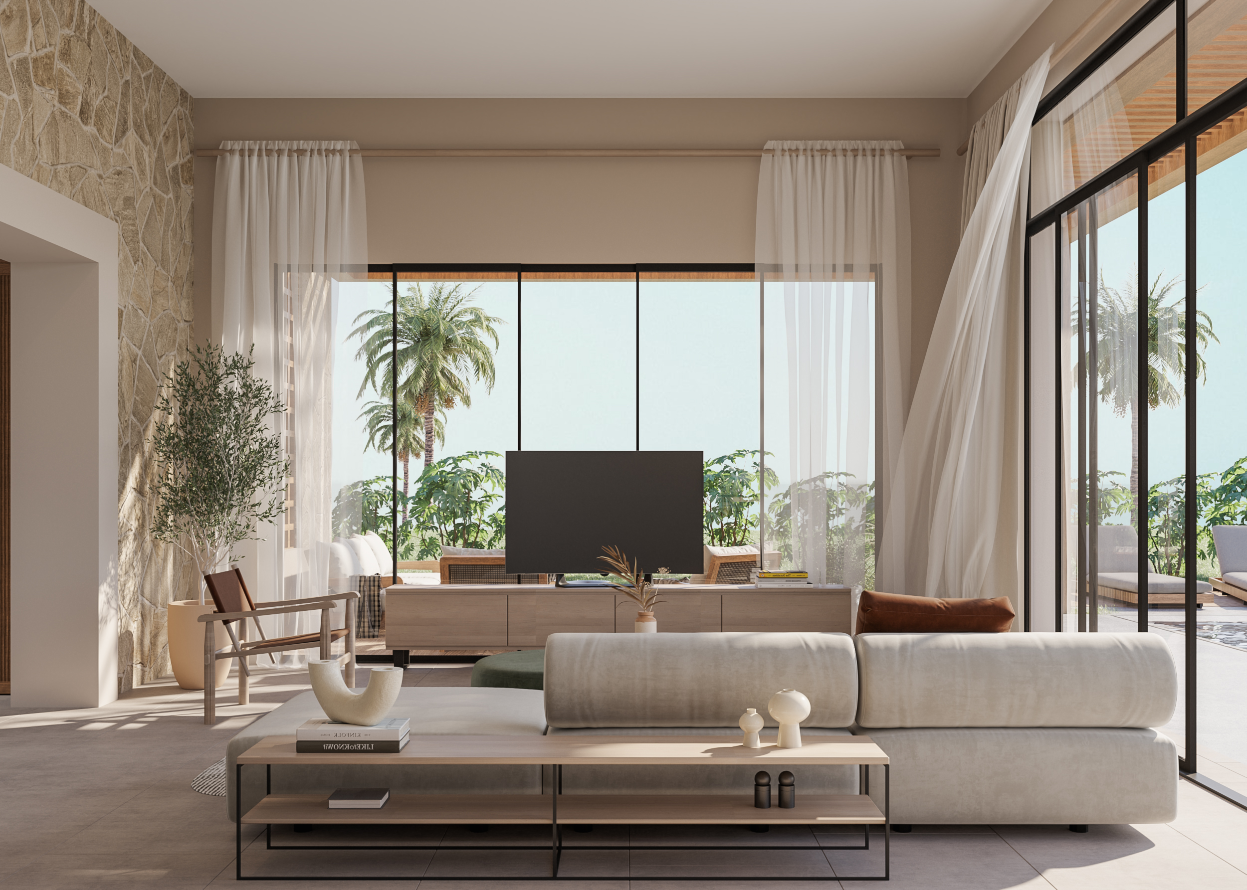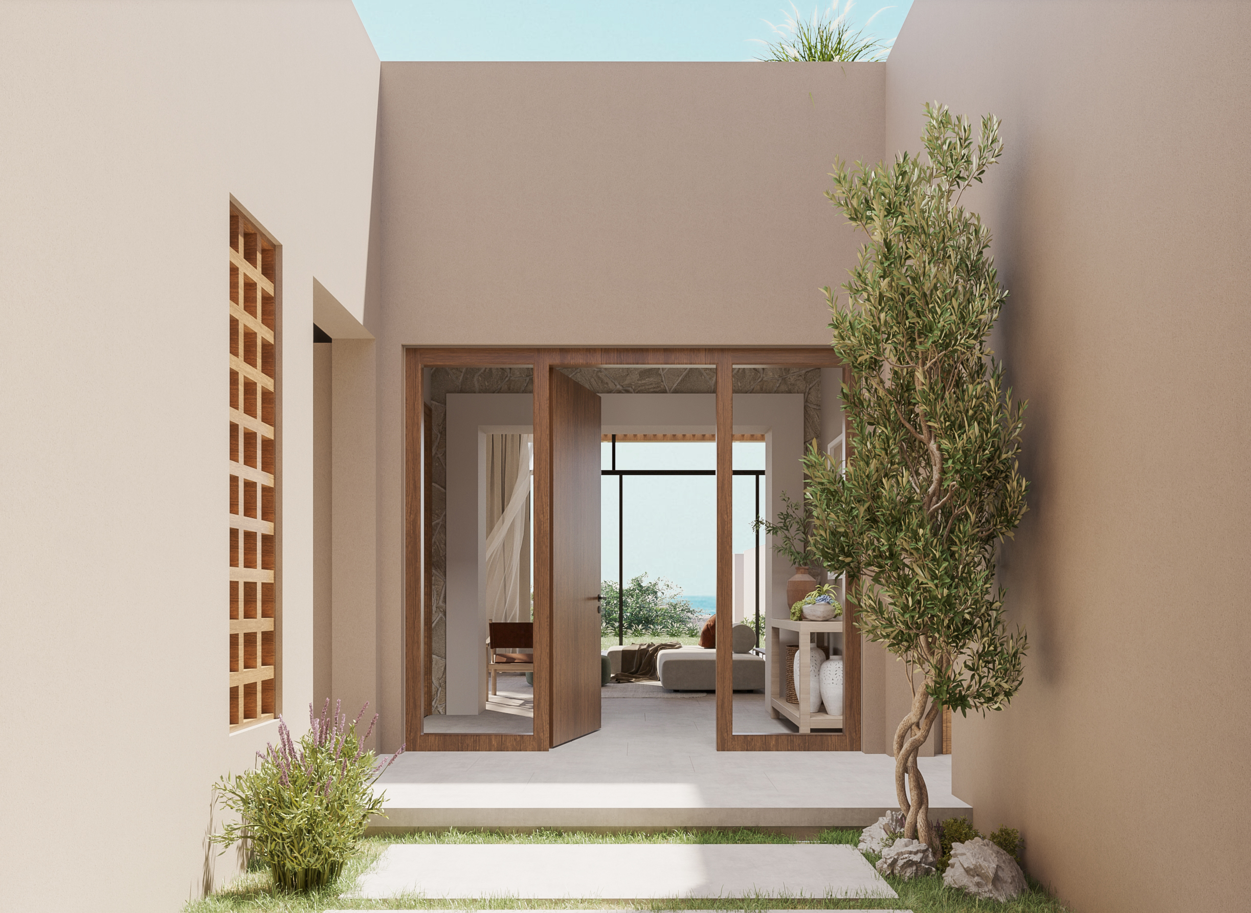 Ledge Flare provides a nice and wide view for the main spaces of the houses. In addition, the outdoor side courtyards and covered outdoor living spaces emphasize on blurring the boundary between in and outdoor areas. The target is to introduce a livable land boundary not a livable house boundary. There is an interplay with natural light by controlling its indirect access to each room. The spaces created between the volumes create a contrast between light and shadow throughout the building.